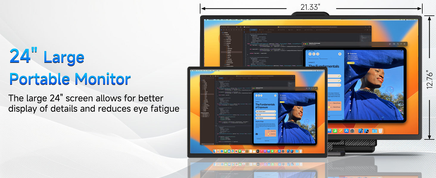 Big screen freedom for work & play, Unlock desktop-grade visuals anywhere! This 24 inch FHD (1920x1080) dual monitor delivers 100Hz refresh rate for ultra-smooth gaming/scrolling, 300-nit brightness, and 178° IPS wide view. HDR enhancement + adjustable backlight/volume create immersive clarity – perfect for work or movies on-the-go.