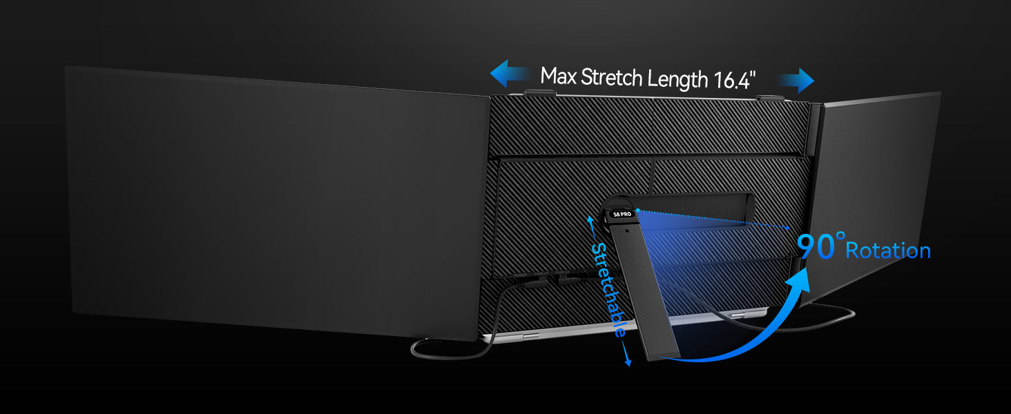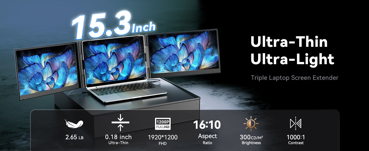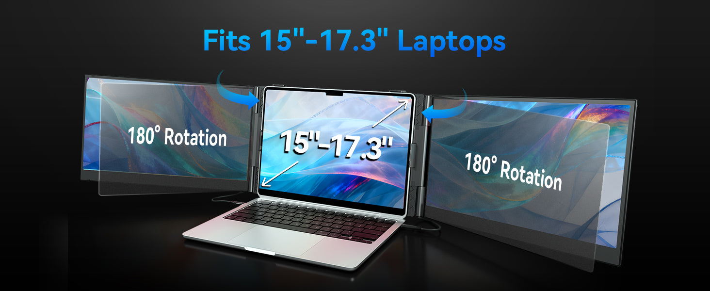 Get ready to experience a game-changing level of portability.At a mere 4.6mm thin and weighing just 2.65lb, this laptop screen extender is significantly lighter (30% less than traditional triple-screen setups tipping the scales at 3.6lb). It is tailored for 15-17.3" laptops to enjoy a comfort extended view world.