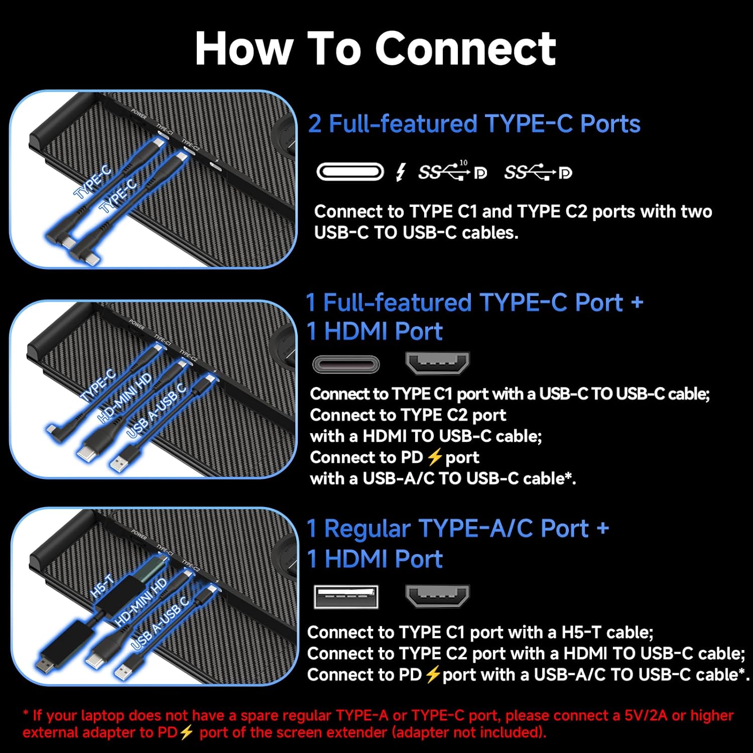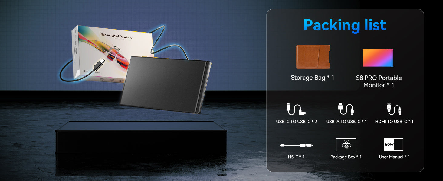 Enjoy instant connectivity with our complete cable kit of travel monitor for laptop including 2 USB-C TO USB-C (full function), 1 USB-A to C, 1 HDMI to C and 1 H5-T cable. No drivers required. This laptop portable monitor ensures fast, stable data transmission, allowing you to effortlessly switch between work presentations and entertainment content.