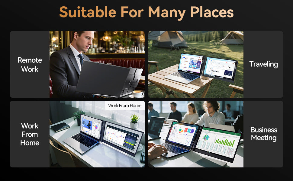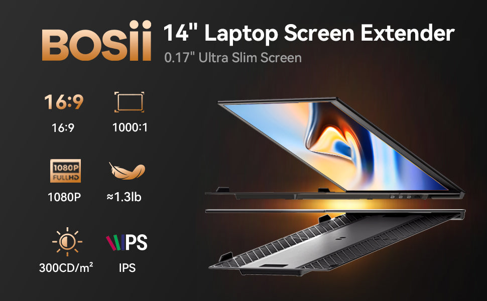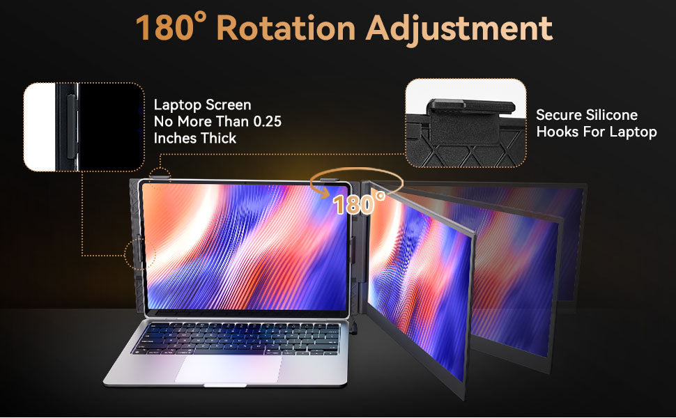 The reinforced clamp securely fits 14-17" laptops (≤0.25" thick) without bending. Features a 1080P IPS panel, 300 nits brightness, and anti-glare coating for vibrant, eye-friendly viewing in any lighting.